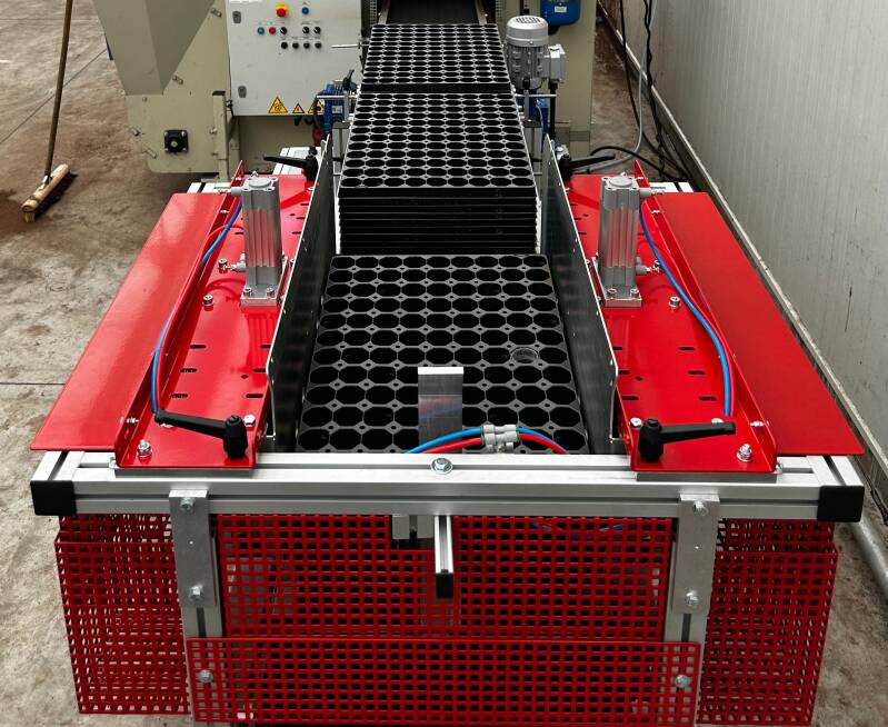 Op deze trayontstapelaar is een stapelaanvoerband optioneel.